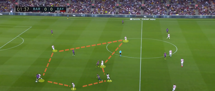 高位逼抢(High Pressing)是一种通过在对方半场进行紧密防守、压迫性拦截的战术方式,迫使对方出现失误并迅速转化为进攻。该战术强调球队整体的压迫性和高压防守,常见于攻守兼备的球队,例如德国的拜仁慕尼黑或英格兰的曼城。高位逼抢要求球员在全场范围内进行紧密配合,尤其是前场的球员需要迅速移动并干扰对方的传球线路,逼迫对方失误或者迫使对方将球丢失。