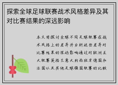 战术风格不仅仅是球队在比赛中的打法,它还涉及到球员的个性特点、球队的整体战略以及教练的指挥水平。每个球队的战术风格都有其独特性,进攻型、反击型、控球型等不同战术风格对比赛结果有着不同的影响。